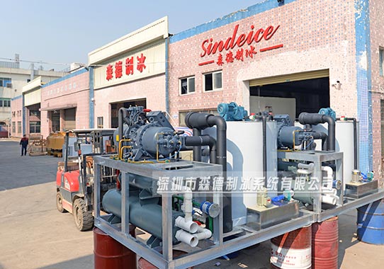 片冰機通電運行,制冷劑(冷媒)通過壓縮機的做功變成高溫高壓的蒸汽工質,再流入冷凝器與外界換熱,放出熱量變成高壓液態工質,流經過濾器過濾后通過膨脹閥降壓降溫為汽液混合狀態,然后進入蒸發器,與片冰機蒸發器內壁上的水進行熱交換,吸收大量的熱,使水急劇降到結冰點以下溫度,瞬速結冰。此時制冷劑經過吸收熱量后蒸發成為氣態,被吸入壓縮機內進行循環,從而實現循環制冷。