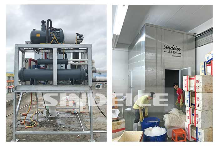 一、海鮮捕撈需要船用制冰機,由于漁船條件有限,漁船發電機組功率限制,一般船用制冰機產量在1噸-6噸之間。森德海水船用制冰機特點: