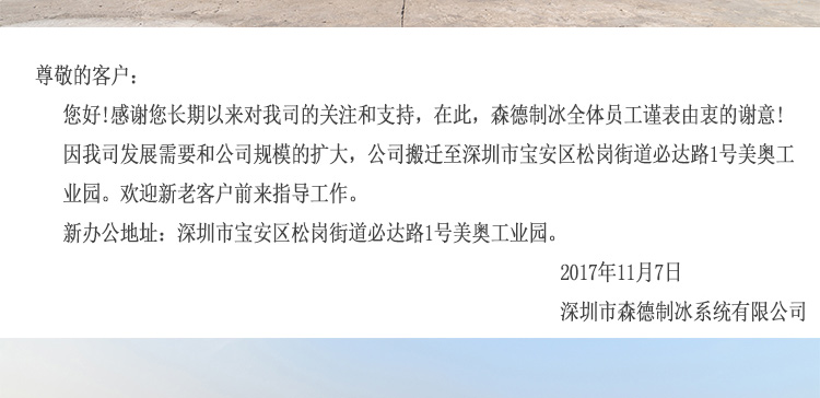 感謝多年來(lái)一直陪伴森德制冰成長(zhǎng)的全體員工,沒(méi)有你們的努力付出,就不會(huì)有森德制冰今日成就。感謝信任和支持森德制冰的合作方,與森德制冰共同發(fā)展。你們見(jiàn)證了森德制冰發(fā)展,由產(chǎn)值不到千萬(wàn)的小企業(yè),經(jīng)過(guò)短短幾年發(fā)展,產(chǎn)值達(dá)近5000萬(wàn)制冰設(shè)備服務(wù)商,成為制冷行業(yè)發(fā)展最迅猛的企業(yè)。因原來(lái)老廠房設(shè)施破舊,不管是小小的航吊還是廠房面積均不能滿足現(xiàn)有的發(fā)展需求。公司股東研究決定擴(kuò)大生產(chǎn)規(guī)模,搬遷至更能適合生產(chǎn)大型制冷設(shè)備的承重航吊廠房。公司由原來(lái)地址:深圳市寶安區(qū)松崗街道沙浦沙二工業(yè)區(qū)原雙木林院內(nèi),搬遷至新地址:深圳市寶安區(qū)松崗街道燕川必達(dá)路1號(hào)美奧工業(yè)園。新地址公司相關(guān)人員已 送至合作方。特此通知,如有不便還望海涵