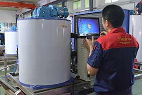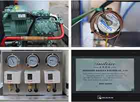 片冰機(jī)主要由壓縮機(jī)、冷凝器、膨脹閥、蒸發(fā)器等配件組成,制冰行業(yè)熟稱制冷四大件。除制冷四大件外,片冰機(jī)還有干燥過濾器、單向閥、電磁閥、截止閥、油壓表、電箱、高低壓開關(guān)、水泵等配件。 1、壓縮機(jī),為制冰機(jī)提供動(dòng)力,是制冰機(jī)的心臟。吸入低溫低壓的汽態(tài)冷媒壓縮成高溫高壓的液態(tài)冷媒。 2、冷凝器,冷凝器有風(fēng)冷和水冷兩種,主要靠風(fēng)扇帶走多余熱量,把高溫的汽