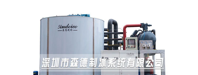 片冰機主要由壓縮機、膨脹閥、冷凝器、蒸發器組成,形成一個循環封閉的制冷系統。片冰機蒸發器為垂直豎立的桶裝結構,主要由冰刀、主軸、灑水盤、接水盤組成。它們在減速機的帶動下,逆時針緩慢旋轉。水從片冰機蒸發器的進水口進入分水盤,通過灑水盤,將水均勻的灑在蒸發器內壁,形成水膜;水膜與蒸發器流道中的制冷劑進行熱交換,溫度迅速降低,在蒸發器內壁上形成一層薄冰,在冰刀的擠壓下,碎裂成片冰,從落冰口掉入儲冰庫。部分未結成冰的水通過接水盤從回水口回流到冷水箱內,通過冷水循環泵進入下一個循環。